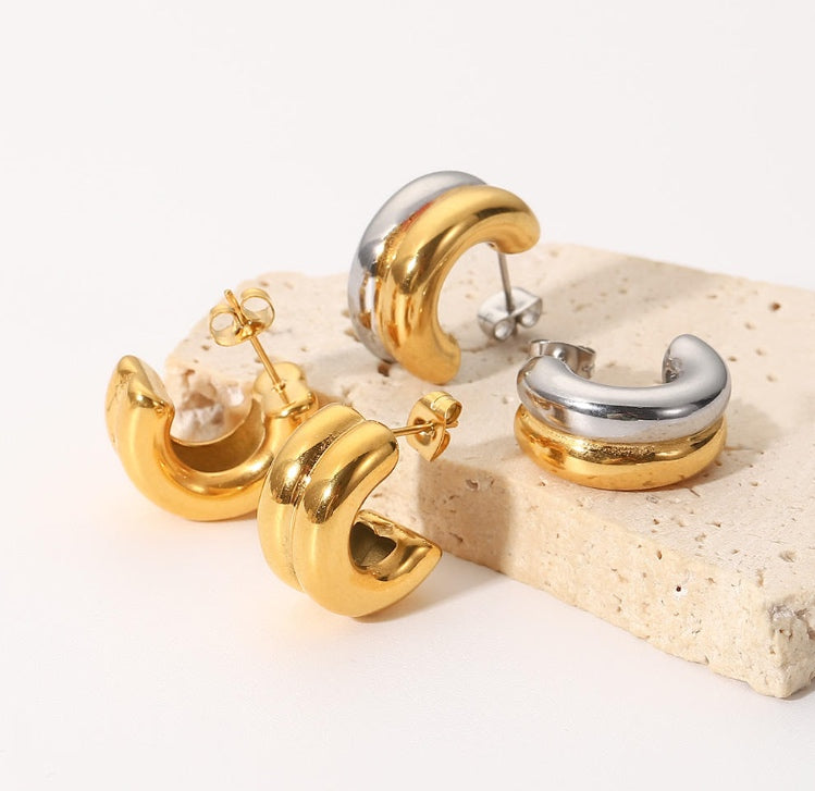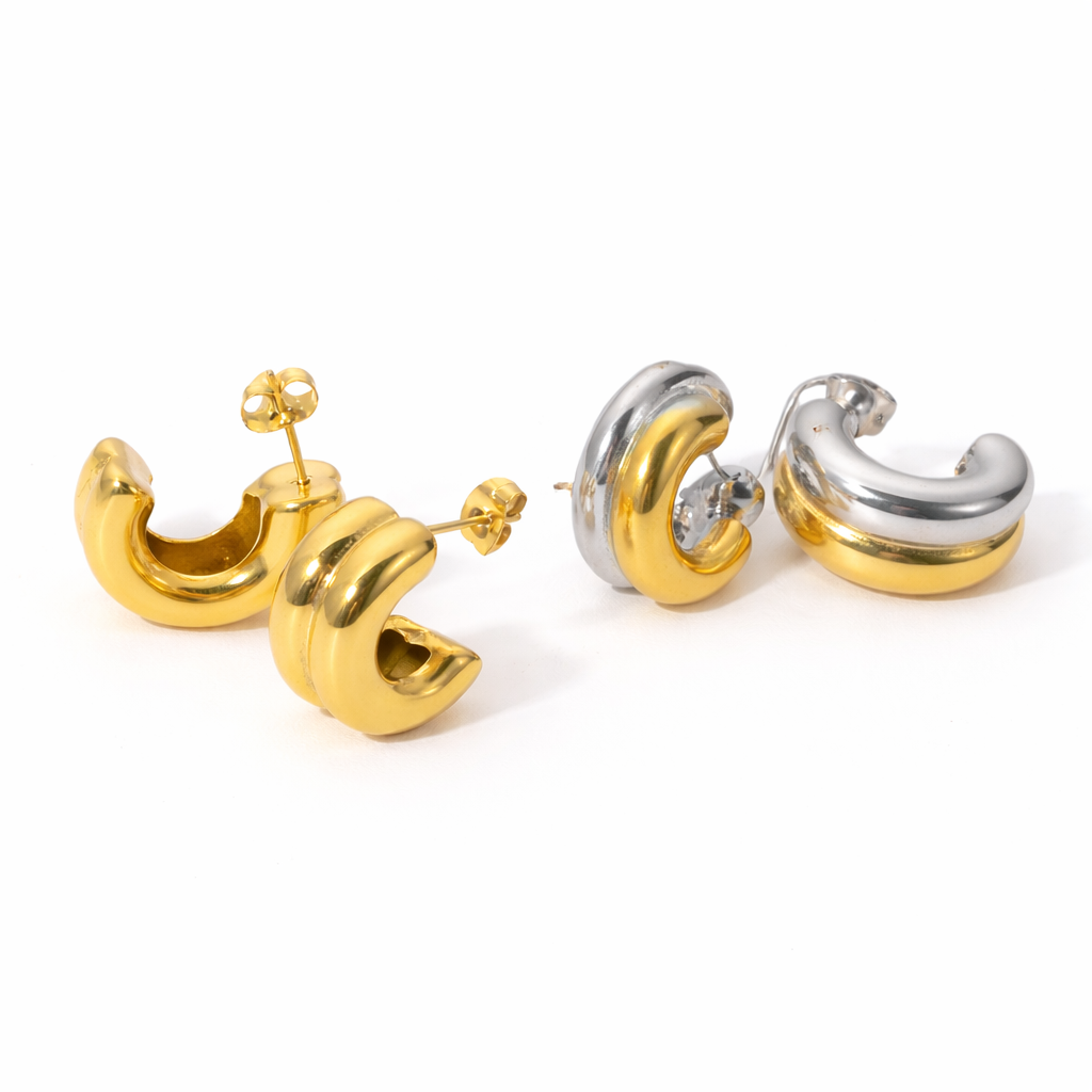 Double Down Huggies: Are you an all-or-nothing kind of person? Shop VibeSzn's Double Down Huggies in real 18k gold plating and go all in with these chunky half hoop earrings— 100% tarnish free so you don't have to worry about taking them off in the gym, at the beach, or in the shower.