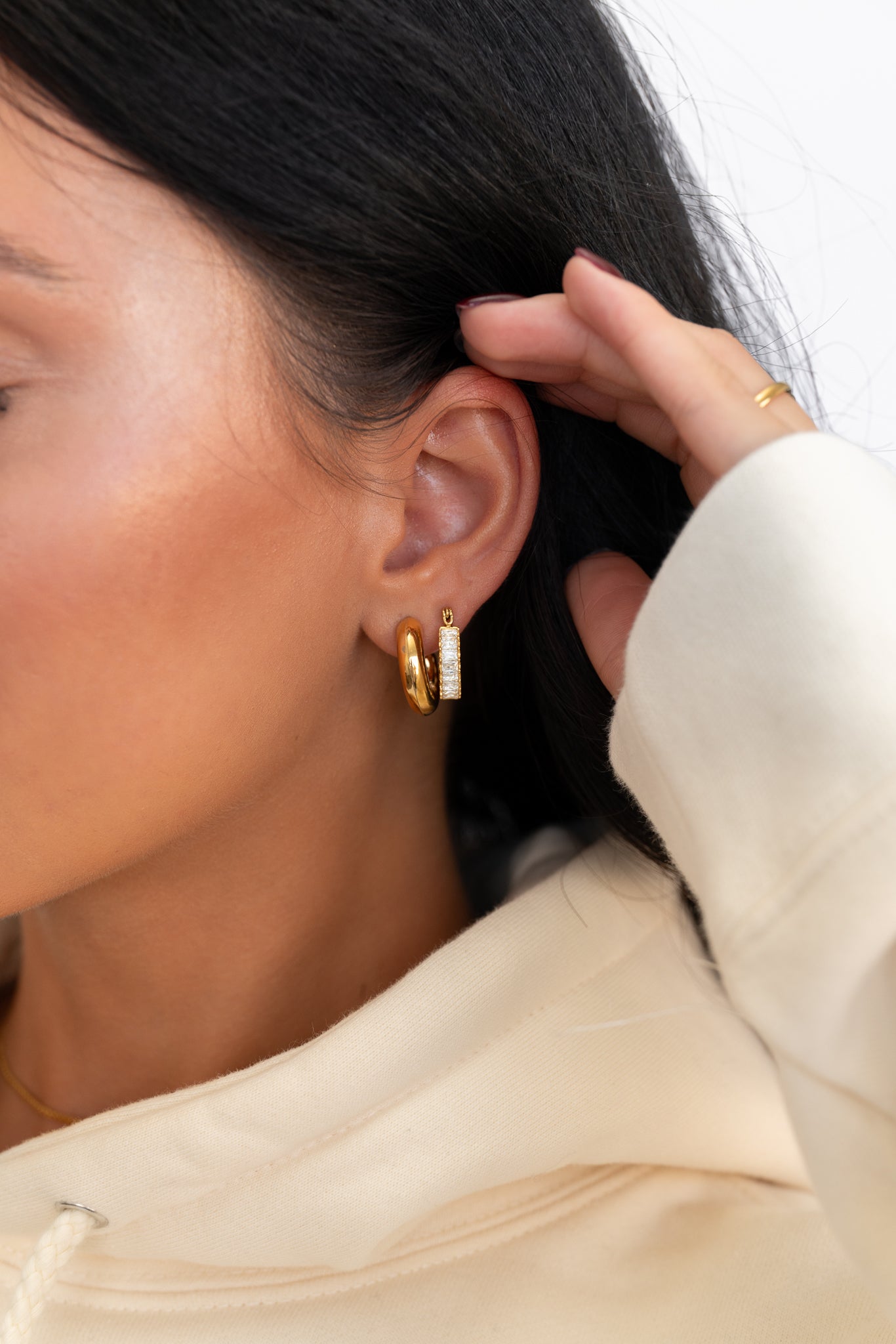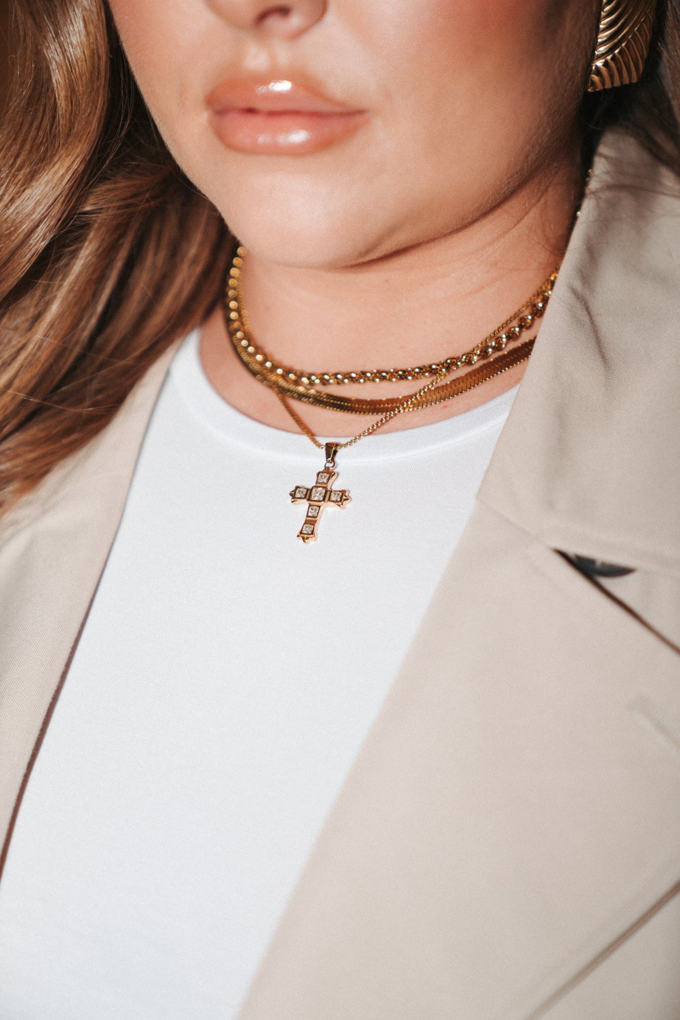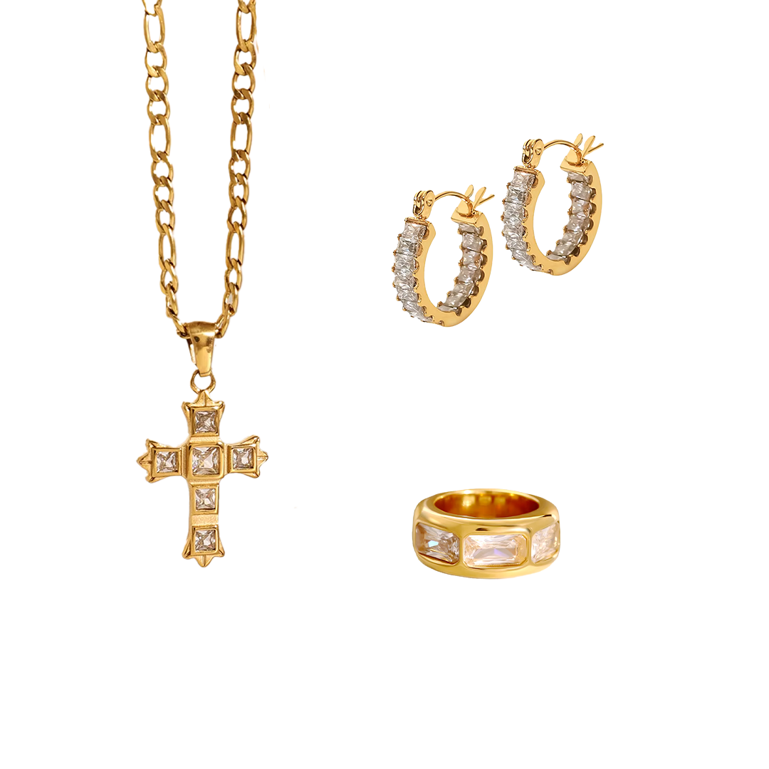 The Frosted Set consists of the Gem Cross Pedant necklace in your choice of Crystal or Emerald, The Baguette Huggies, and the Genevieve Band in your choice of Crystal or Emerald.