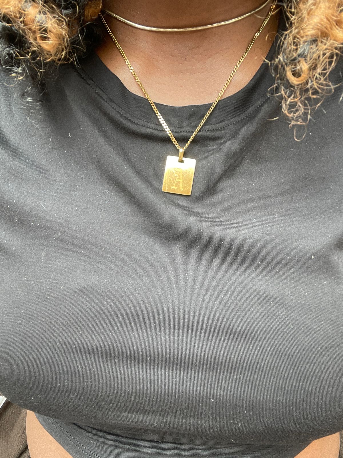 Are you looking for a custom detail? This is a perfect piece stamp design gold tag! The Old English Tag looks effortless and elegant on every neck. Pairs well with Iced Croix and the Old English Birthdate Necklace.