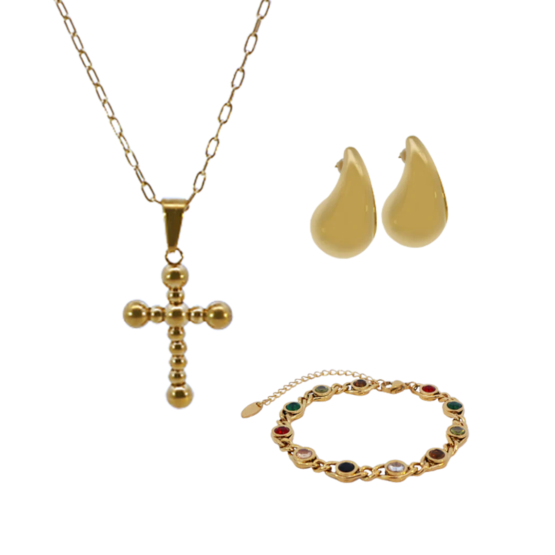 Set includes: Ball & Chain Cross Necklace, Teardrop Earrings, & Gemstone Bracelet