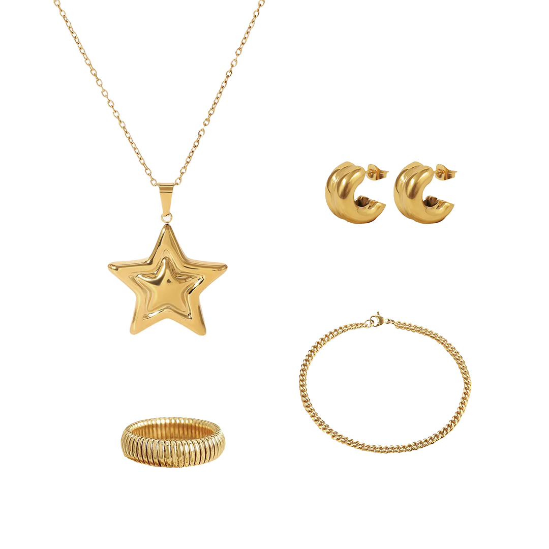 The Gameday Set includes the Star Pendant in your choice of Gold or Mixed Metal, the Double Down Huggies, The Daily Band, and the Dainty Curb Chain Bracelet in your choice of Gold or Silver.