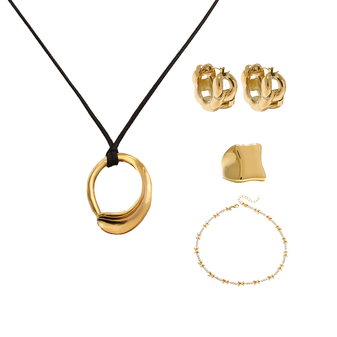 The Lonestar Set includes the Sage Pendant, the Oversized Chainlink Earrings, the Hourglass Signet Ring in Gold or Silver, and the Sedona Bracelet.