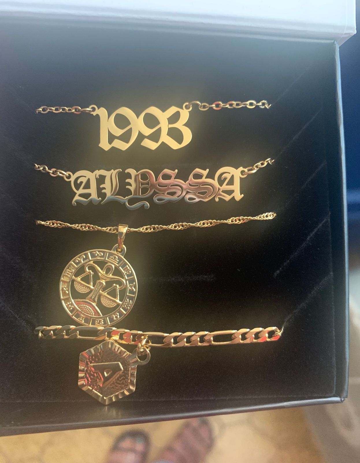 It does not get any better than this, all your dream necklaces in one place! Lock in your look with our Top Seller Set. The combination of the Old English Birthdate Necklace, the Custom Nameplate Necklace and the Horoscope Pendant. We have added more options for font and options for chain type.